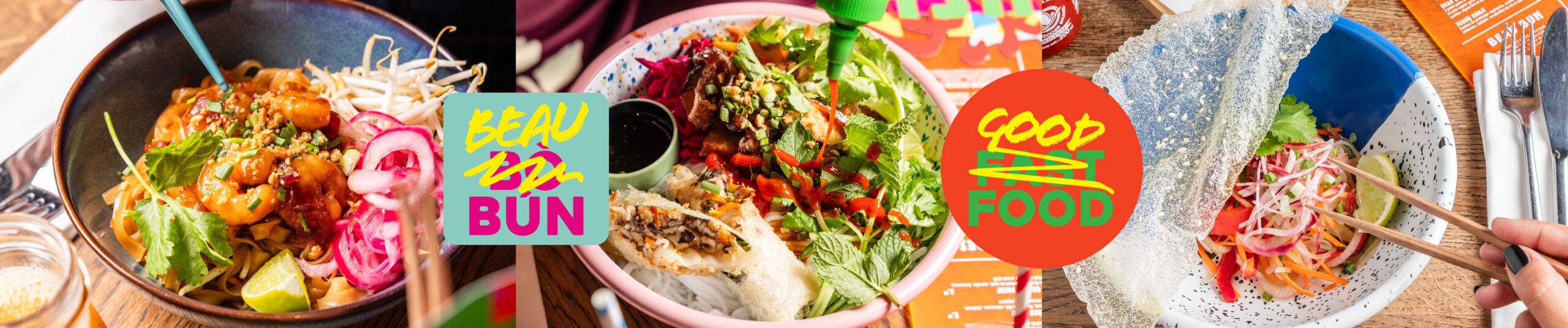Nouilles de riz, bœuf mijoté finement tranché, bœuf cru, carottes, pickles d’oignon rouge et bouillon aux épices